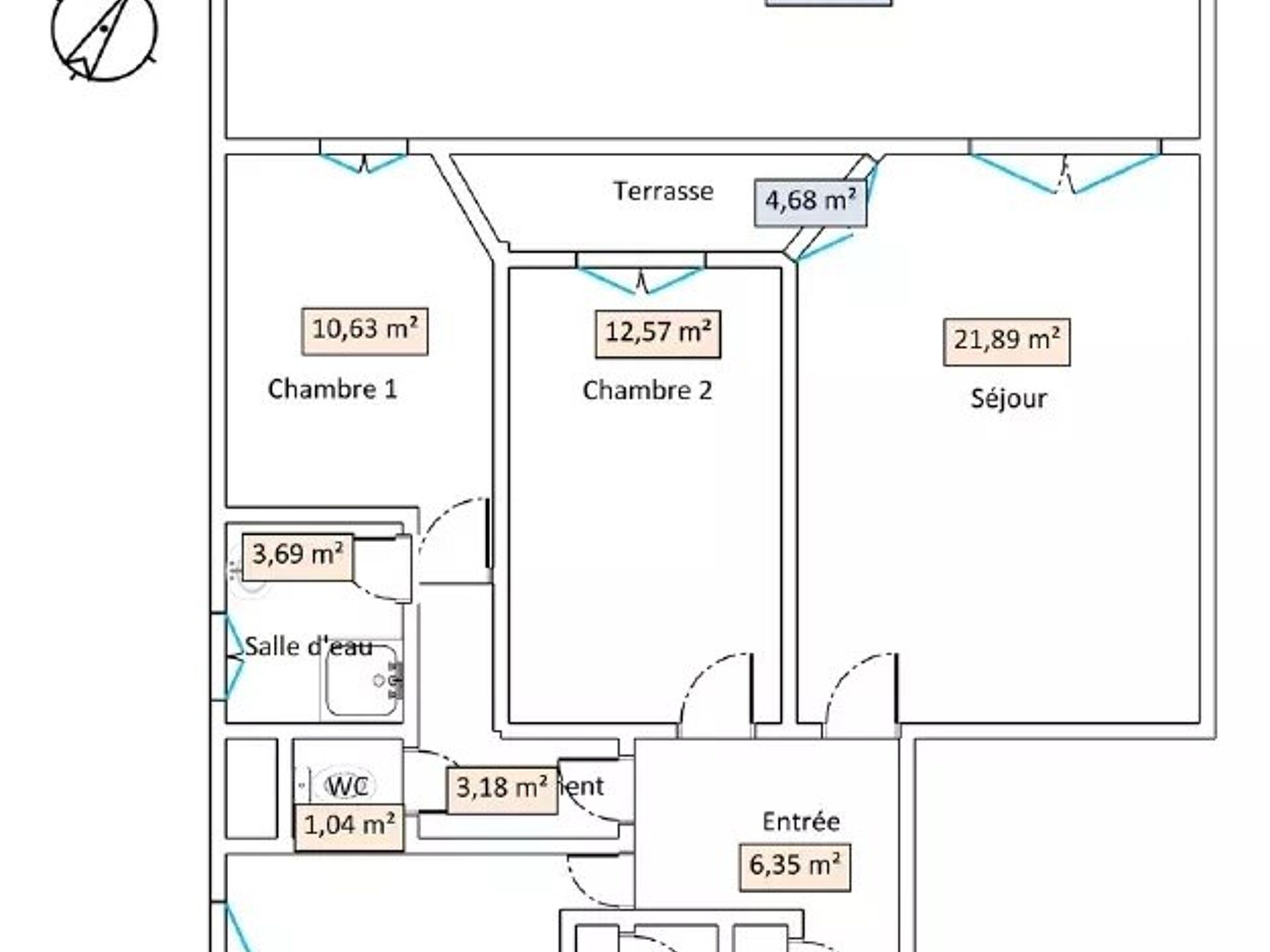 Il est composée d’une entrée de 6.35 m² avec placard , dressing 3.71m² , pièce de vie de 21.89m² donnant sur l’extérieur, 2 chambres dont une de 12.57m² avec dressing , salle d’eau avec fenêtre , WC séparé