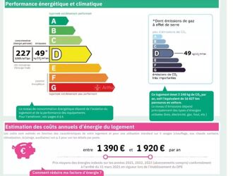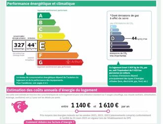 Pour passer le DPE en E ( isolation de certains murs et mise en place d'une VMC hygro ) un devis est en cours mais devrait être entre 4 et 5000 € , le cout réel de la consomation gaz+électricité annuelle sur 2024 /2025 est de 1800 € !