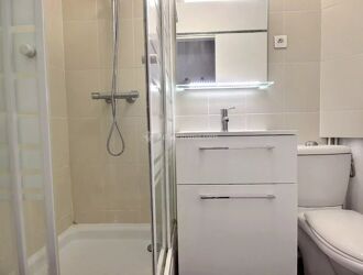 Il est composé d’une pièce de vie avec cuisine équipée DE TRES BELLE FACTURE ( plaque vitrocéramique 4 feux, hotte, four, emplacement pour machine à laver de 60 cm), espace chambre et bureau de 14m² env, salle d’eau très agréable de 2.35 m² avec grande douche à l’italienne , meuble vasque et WC.